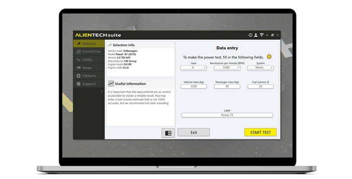 With a guided and intuitive process, you can activate DynoDrive and use the function immediately: simply select the vehicle on which the test will be performed, set the necessary data for the calculation, and launch the test.