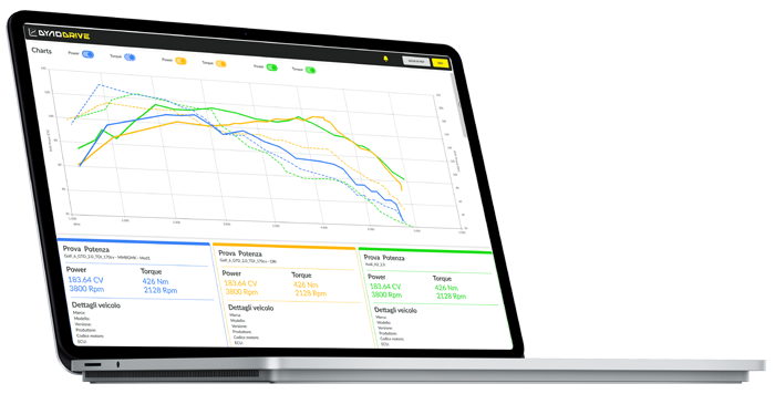 At the end of the test, the Dashboard automatically stores the torque and power values. In addition to numerical data, DynoDrive provides Cartesian graphs that can be compared by overlaying them to easily discern and compare curve differences at a glance. The software allows for comparing up to 3 tests simultaneously. To facilitate consultation, different colors and styles have been assigned to the curves of individual tests.